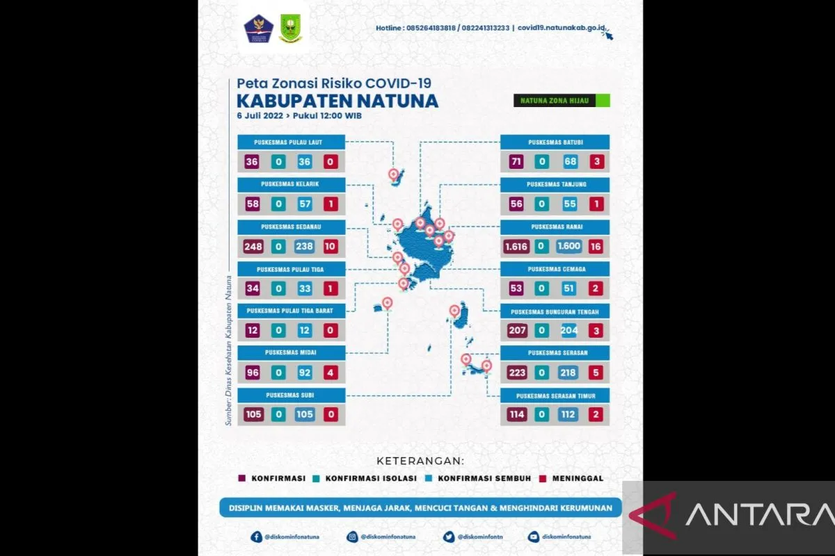 "Pada hari ini Rabu, tanggal 6 Juli 2022, kami sampaikan satu kasus COVID-19 sudah selesai isolasi, sembuh," kata Kepala Dinas Kesehatan Kabupaten Natuna, Hikmat Aliansyah di Ranai, Natuna, Kepulauan Riau, Rabu.