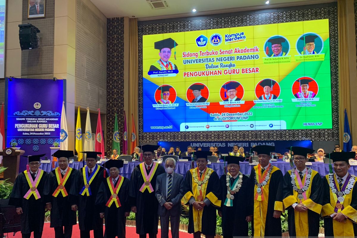 Padang (ANTARA) - Universitas Negeri Padang (UNP) Sumatera Barat mengukuhkan lima guru besar dalam Rapat Senat Akademik Universitas yang digelar secara terbuka di Auditorium Universitas Negeri Padang, Sabtu (24/12).