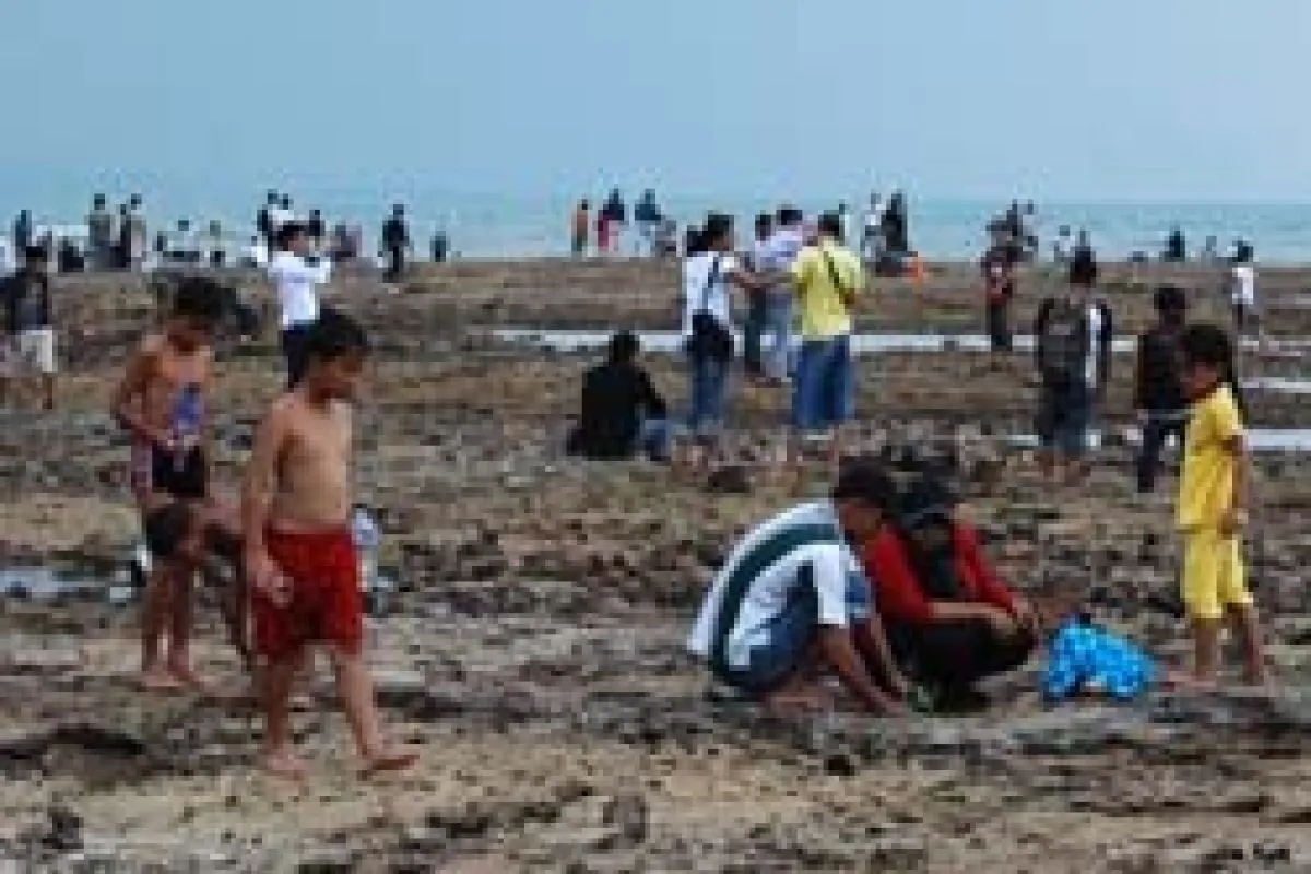 Di pantai tersebut, ribuan orang yang tiba dengan bis, angkutan kota, sepeda motor dan mobil pribadi menikmati semilir angin, hamparan pasir, berjalan di karang, mandi-mandi atau sekadar mengamati binatang karang misalnya anak kepiting dan siput laut.