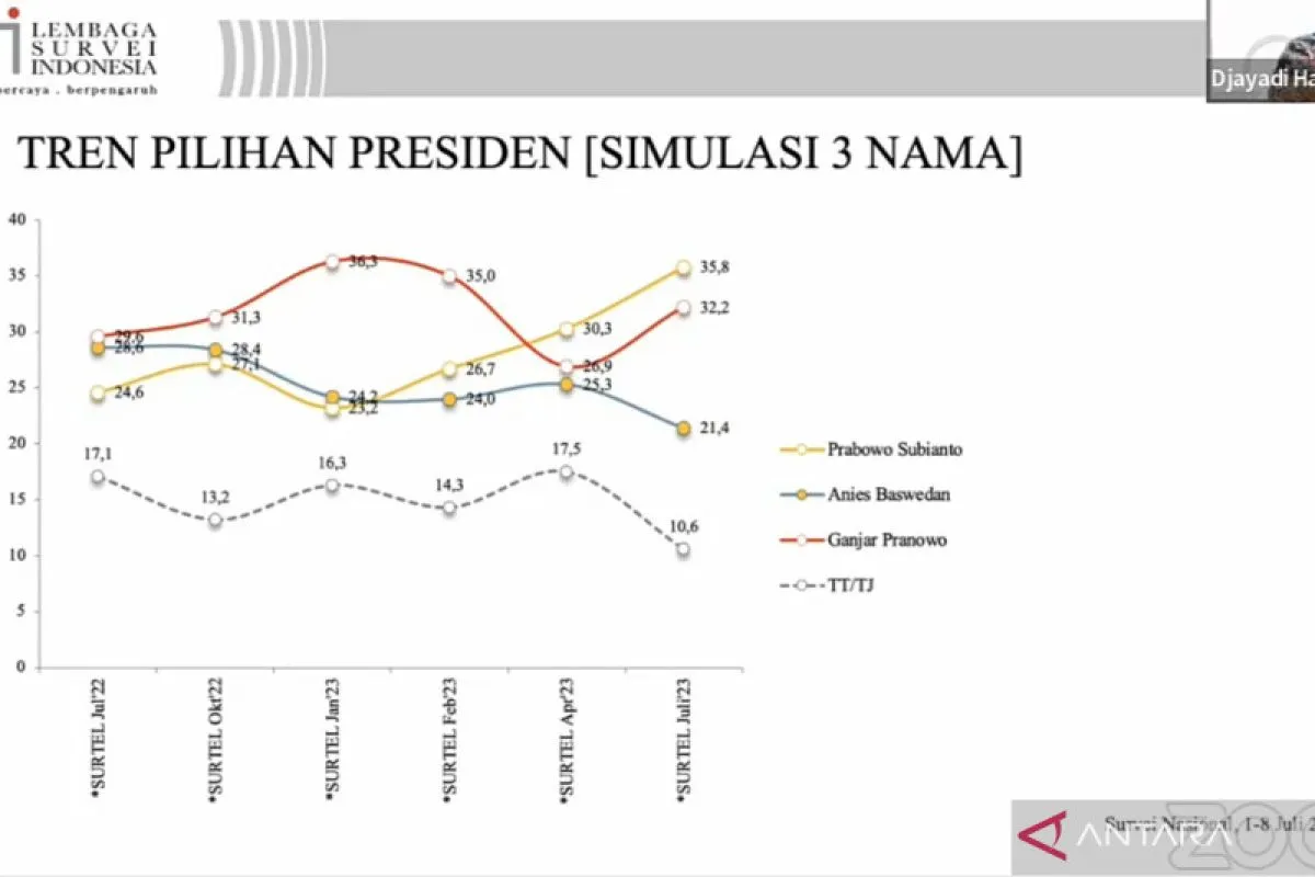 Kemudian, pada April 2023, elektabilitas Prabowo menjadi 30,3 persen dan dalam survei terbaru LSI pada Juli 2023 mencapai 35,8 persen atau menduduki posisi teratas.
