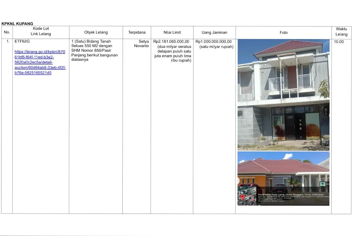 Kemudian aset tersebut berupa satu bidang tanah seluas 550 meter persegi beserta bangunan di atasnya yang berlokasi di Kelurahan Pasir Panjang, Kecamatan Kelapa Lima, Kota Kupang, NTT.