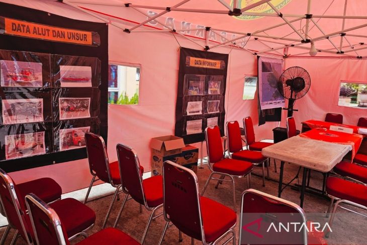 Meja-meja kerja tersusun rapi di tenda BPBD. Beberapa dilengkapi komputer dan radio komunikasi, sementara meja lainnya digunakan untuk rapat kilat ketika laporan masuk tanpa memberi jeda bagi para petugas.