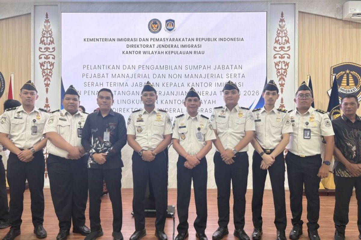 Batam (ANTARA) - Kantor Wilayah Direktorat Jenderal Imigrasi Kepulauan Riau menyelenggarakan kegiatan Serah Terima Jabatan (Sertijab), Pelantikan Pejabat Struktural, serta Penandatanganan Pakta Integritas di lingkungan Kantor Imigrasi Kelas II TPI Ranai.