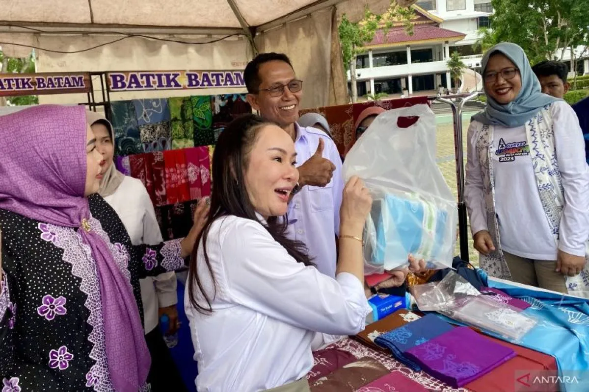 Wali Kota Batam Amsakar Achmad dan Wakil Wali Kota Li Claudia Chandra sedang mendukung UMKM kerajinan Kota Batam, Kepri. (ANTARA/Amandine Nadja)