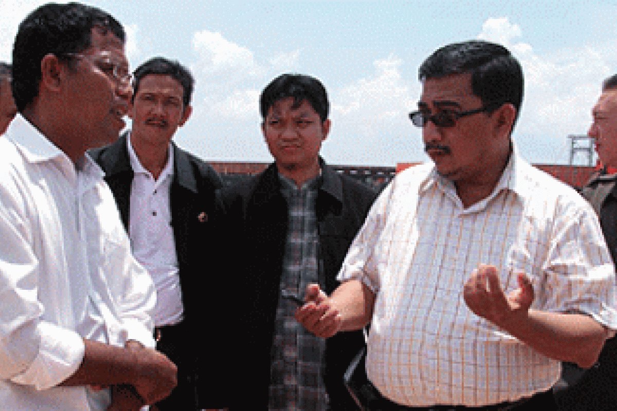 Komisi A DPRD Karimun, Senin (18/10) memeriksa mendadak areal reklamasi pantai PT Multi Ocean Shipyard (MOS) di Tanjung Melolo, Pangke, Kecamatan Meral. Sidak berkaitan dengan perizinan dan kontribusi kegiatan reklamasi yang menggunakan tanah urug milik pemerintah daerah. PT MOS berencana mereklamasi lahan pantai tersebut seluas 100 hektare untuk kepentingan industri galangan kapal. Tampak Site Manager PT MOS, Bakir (dua kanan) sedang memberi penjelasan kepada rombongan dewan terkait kegiatan reklamasi. (Foto kepri.antaranews.com/Rusdianto)