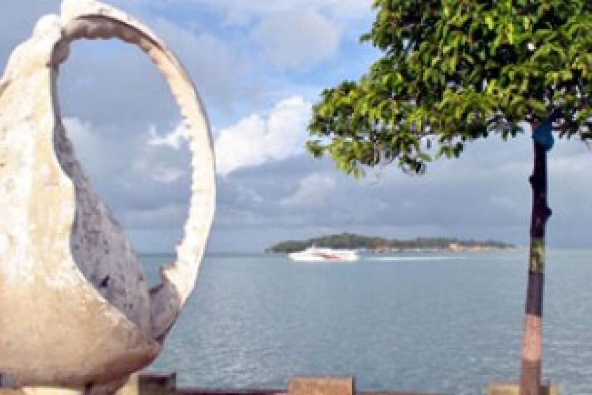 Sebuah kapal melintas di depan replika gonggong (keong laut) di tepi laut Tanjungpinang, Kepri, Jumat (28/1). Pemerintah setempat dalam waktu dekat akan membangun gedung auditorium gonggong di tempat itu untuk balai pertemuan dan panggung hiburan rakyat.(kepri.antaranews.com/Henky Mohari)
