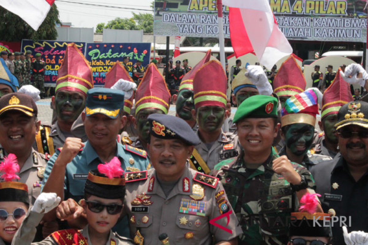 Dia juga mengungkapkan kekagumannya dengan kebersamaan TNI-Polri yang ditunjukkan sejak turun dari kapal hingga memimpin apel empat pilar. Danlanal Karimun Letkol Laut (P) Totok Irianto bertindak sebagai komandan apel dan Dandim 0317/Karimun Letkol Arm Rizal Analdie sebagai perwira apel, dengan peserta apel terdiri atas personel TNI dan Polri, Satpol PP, ormas, OKP dan pramuka.