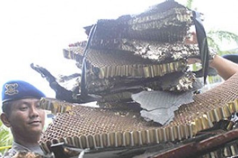 Sejumlah petugas kepolisian dan perhubungan mengangkut serpihan komponen pesawat terbang A-380 Maskapai Penerbangan Qantas, Australia, di 12 lokasi Kecamatan Batam Kota, Batam, Kepulauan Riau, Kamis (4/11). Warga mendengar ledakan, melihat asap hitam dan hujan serpihan dari pesawat yang kembali ke Singapura dengan selamat setelah dalam perjalanan menuju Australia, mengalami kerusakan teknis. (Foto ANTARA/Str-Yunianti Jannatun Naim)
