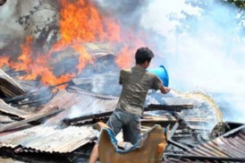 Seorang warga menyiramkan seember air untuk memadamkan api yang menghanguskan enam kamar kontrakan di Jalan Agus Salim Tanjungpinang, Kepri, Senin (13/6). Kamar kontrakan semi permanen yang berisi sekitar 434 lembar kasur lantai tersebut ludes selama 30 menit, polisi masih menyelidiki penyebab kebakaran dan kerugian diperkirakan puluhan juta rupiah. (kepri.antaranews.com/Henky Mohari)