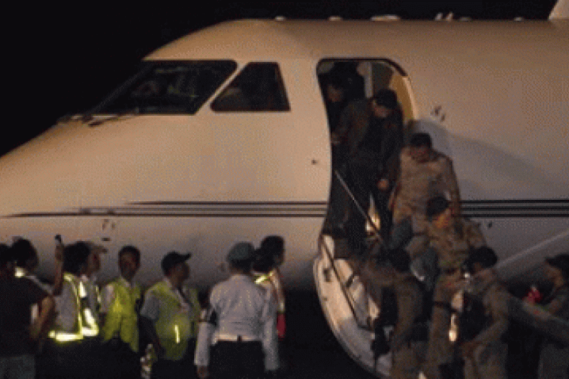 Tersangka kasus suap Wisma Atlet SEA Games, Muhammad Nazaruddin (kedua dari atas), dikawal sejumlah petugas kepolisian dan Komisi Pemberantasan Korupsi, turun dari pesawat saat tiba di tanah air melalui Bandara Halim Perdanakusumah, Jakarta, Sabtu (13/8) malam. Mantan bendahara Partai Demokrat yang melarikan diri ke luar negeri lebih dari dua bulan, akhirnya tertangkap di Kolombia dan tiba di Jakarta sekitar pukul 20.00 WIB. (ANTARA/Ismar Patrizki/spt/11/Btm10