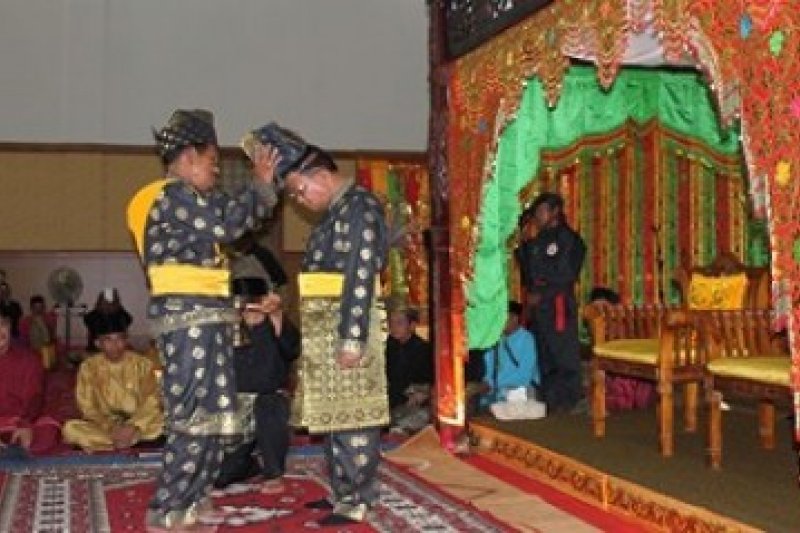 Ketua Lembaga Adat Melayu Natuna Wan Yawali memasang tanjak ke kepala Bupati Natuna Ilyas Sabli yang dianugerahi gelar Datuk Setia Amanah di Ranai, Natuna, Jumat (4/4) (kepri.antaranews.com/Rosyita/rd)
