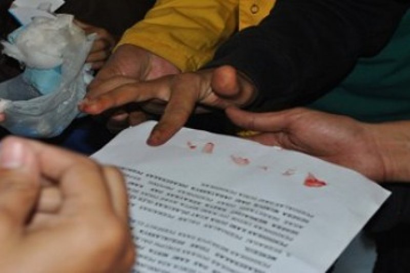 Sejumlah mahasiswa dan gabungan organisasi masyarakat yang tergabung dalam Gerakan Aliansi Masyarakat Kepulauan Riau membubuhkan cap darah pada pernyataan sikap yang diserahkan kepada sejumlah media massa dalam aksi unjuk rasa di Dinas Pendidikan Provinsi Kepulauan Riau di Tanjungpinang, Kepri, Kamis (14/6). Gerakan Aliansi Masyarakat Kepulauan Riau menuntut adanya transparansi dalam penyaluran beasiswa yang dinilai tidak tepat sasaran dan juga meminta penegak hukum untuk mengusut dugaan korupsi penyaluran dana beasiswa serta dana informasi pendidikan yang dianggarkan sebesar Rp750 juta dalam APBD Kepri 2011. (kepri.antaranews.com/Henky Mohari)