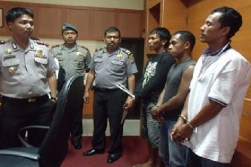 Kapolres Karimun AKBP Benyamin Sapta (kiri), Kasat Polisi Perairan AKP Yoga Buanadipta (tengah) dan Kabag Humas AKP Basta Nababan menginterogasi tiga tersangka perompak, Tha, Sya dan Raz di Mapolres Karimun, Provinsi Kepulauan Riau, Kamis (28/6). Ketiganya ditangkap di tiga lokasi berbeda oleh Satuan Polisi Perairan Polres Karimun, Rabu (27/6) malam karena diduga terlibat perompakan "tugboat" Duta Kapuas 13 saat berlayar menarik tongkang mengangkut CPO asal Palembang tujuan Dumai di perairan Takong Hiu, Kecamatan Tebing, Selasa (12/6). (kepri.antaranews.com/Rusdianto)
