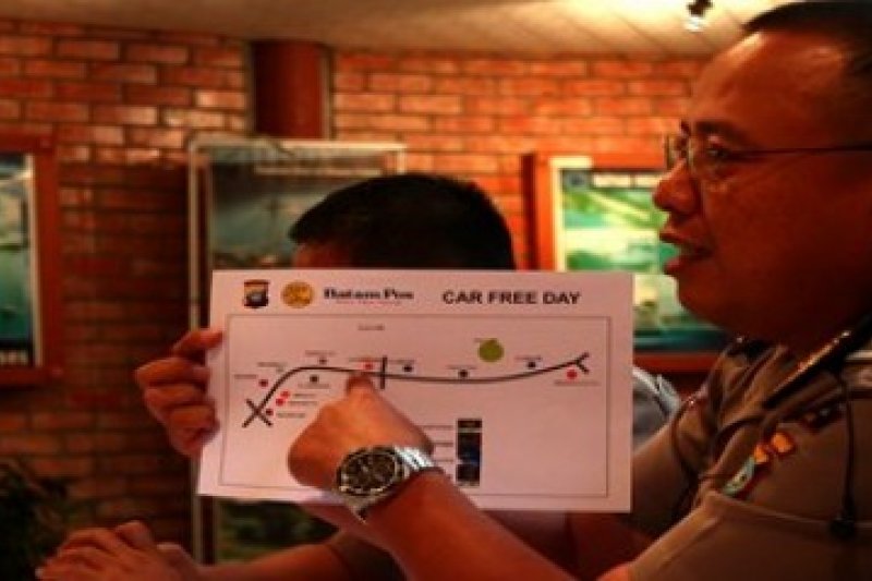Kanit Min Op Polresta Barelang, Iptu Kartijo memperlihatkan rencana rute "Car Free Day" saat jumpa pers di Badan Pengelolaan Batam, Senin, 4/2. Program Car Free Day di Batam belum dilaksanakan secara rutin karena hingga saat ini belum ada Perda yang mendasarinya.(kepri.antaranews.com/Joko Sulistyo)
