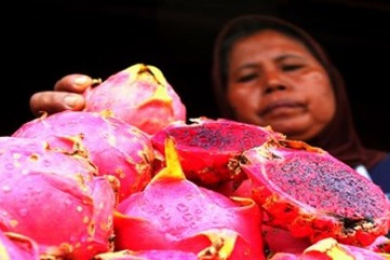 Seorang penjual buah naga (Hylocereus undatus) menyiapkan dagangan di jembatan I Barelang, Batam, Selasa (7/5). Wilayah Pulau Rempang, Galang dan sekitarnya banyak digunakan oleh masyarakat untuk budidaya buah naga, pada akhir masa panen, harga jual mencapai kisaran Rp15 ribu hingga Rp35ribu tergantung ukuran dan kesegarannya.(kepri.antaranews.com/Joko Sulistyo)