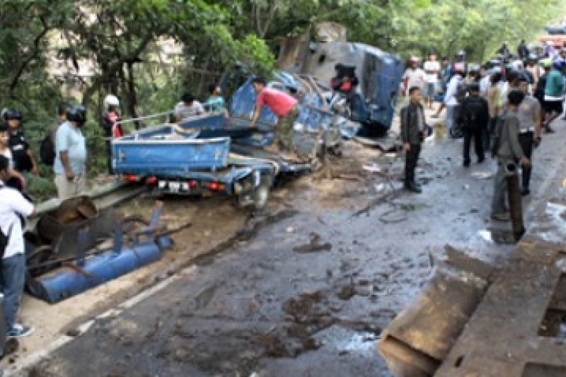 Polantas menjaga lokasi kecelakaan yang melibatkan trailer nopol BP 9084 FU bermuatan yang mesin pabrik yang jatuh menimpa truk nopol BP 8568 ZB di depan gerbang Southlink Golf, Batam, Rabu (22/1). Muatan trailer jatuh karena putus tali pengamannya dan menimpa truk yang berada di lajur kiri jalan, tidak ada korban jiwa dalam peristiwa tersebut, namun menyebabkan kemacetan panjang pada empat lajur jalan itu. (antarakepri.com/Joko Sulistyo)