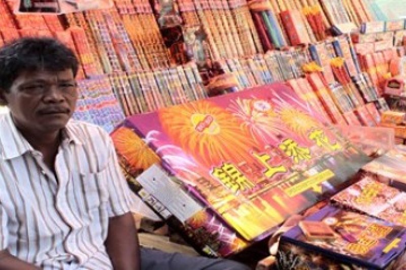 Seorang pedagang kembang api menunggu pembeli di kawasan perdagangan Jodoh, Batam, Rabu (29/1). Berbagai macam kembang api untuk merayakan datangnya tahun baru kalender China dijual dengan harga puluhan ribu hingga jutaan rupiah, tergantung jenis dan ukuran.(antarakepri.com/Joko Sulistyo)