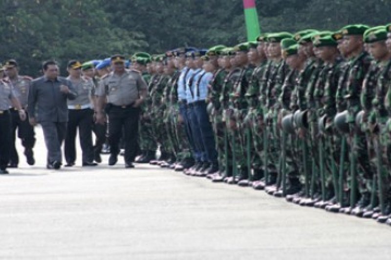 Kapolda Kepri Brigjen Pol Endjang Sudrajat, dan sejumlah Muspida Kepulauan Riau memeriksa barisan K-9 dalam apel siaga pemilu di Stadion Temenggung Abdul Jamal, Batam, Selasa (4/2). Polda Kepri melakukan pemeriksaan kesiapan pasukan gabungan dari unsur TNI, Polri, Satpol PP, Dishub, Senkom Polri, dan Pemadam Kebakaran Kota Batam untuk pengamanan pemilu 2014.(antarakepri.com/Joko Sulistyo)