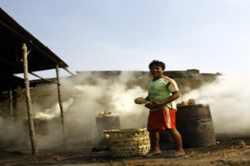 Seorang pembuat arang sedang membakar batok kelapa di Bintan, Kepri, Selasa (11/3). Batok kelapa yang kerap hanya menjadi sampah di sejumlah pasar tradisional diproses menjadi arang yang laku dijual Rp2500 perkilo, dengan kapasitas produksi 150 kilogram perhari, perajin arang batok itu masih kesulitan memenuhi permintaan dari konsumen, terutama industri rumahan otak-otak ikan.(antarakepri.com/Joko Sulistyo)