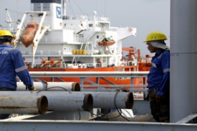 Sejumlah pekerja mengerjakan penambahan instalasi pipa di Pelabuhan Crude Palm Oil (CPO) Kabil, Batam, Selasa (18/3). Penambahan jaringan pipa minyak sawit yang menghubungkan pelabuhan CPO Kabil dengan kawasan industri dilakukan karena adanya peningkatan kapasitas pelabuhan dari semula 200 ribu dead weight ton (dwt) per hari.(antarakepri.com/Joko Sulistyo)